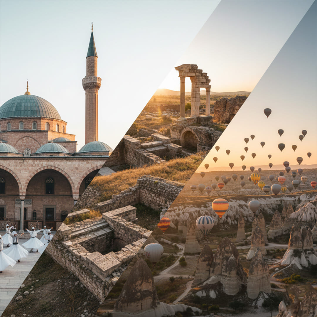 This includes Cappadocia, famous for its cave churches and underground cities used for refuge, and Konya(ancient Iconium), an important historical and spiritual city.